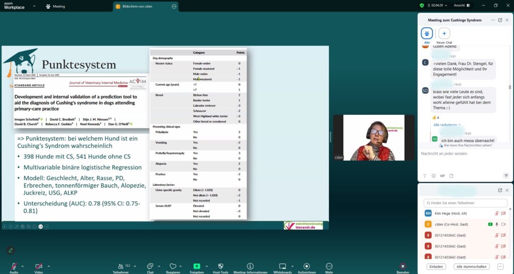 Am 18.02.26 um 19:00 fand das erste große Gastdozentinnen-Live-Modul in der Akademie für Tiermedizin-Wissen statt. Mit 240 Anmeldungen und letztlich 185 live teilnehmenden Tierbesitzer:innen war es ein voller Erfolg! Die großartige Tierärztin Dr. Christiane Stengel (Fachtierärztin für Innere Medizin und Dipl. ECVIM-CA) hielt einen 1,5-stündigen Vortrag zum Thema „Cushing’s Syndrom“. Anschließend wurden weitere 70 Minuten lang Fragen der Teilnehmenden beantwortet. Dank des Sponsorings durch die WDT war das Webinar für die Teilnehmenden sogar kostenlos!